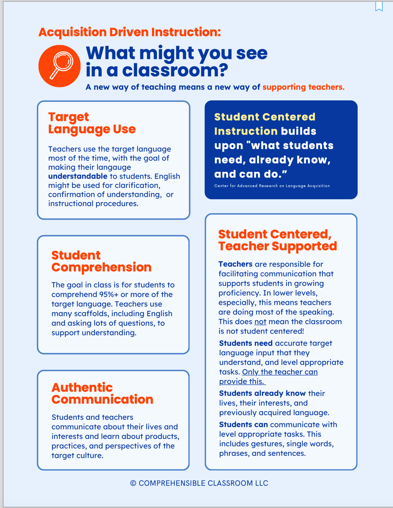 Share this resource with building leadership to help build understanding about practices in an acquisition-driven classroom. You will also find a print-ready version to print and share.